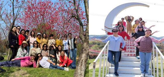 游程的第二站是至九真桃源景区赏花。景区内溪湾柳间栽桃,屋绕梅余种竹,既有自然天成之趣,又假人事巧作之工。徜徉其中,恣意盛放的菊花桃和紫荆,用繁密的粉红与粉紫,点染得春绿分外喜人。映一面嫣红桃夭,赞一声春光婀娜,爱美的女职工们,呼朋引伴,在盛开的花树下和缤纷的造景廊道上,尝试着各种拍摄视角,不厌其烦地取景构图、摆造型,直到拍到那张最心满意足的大片,分享给亲友同事,也收藏入珍贵的记忆中。