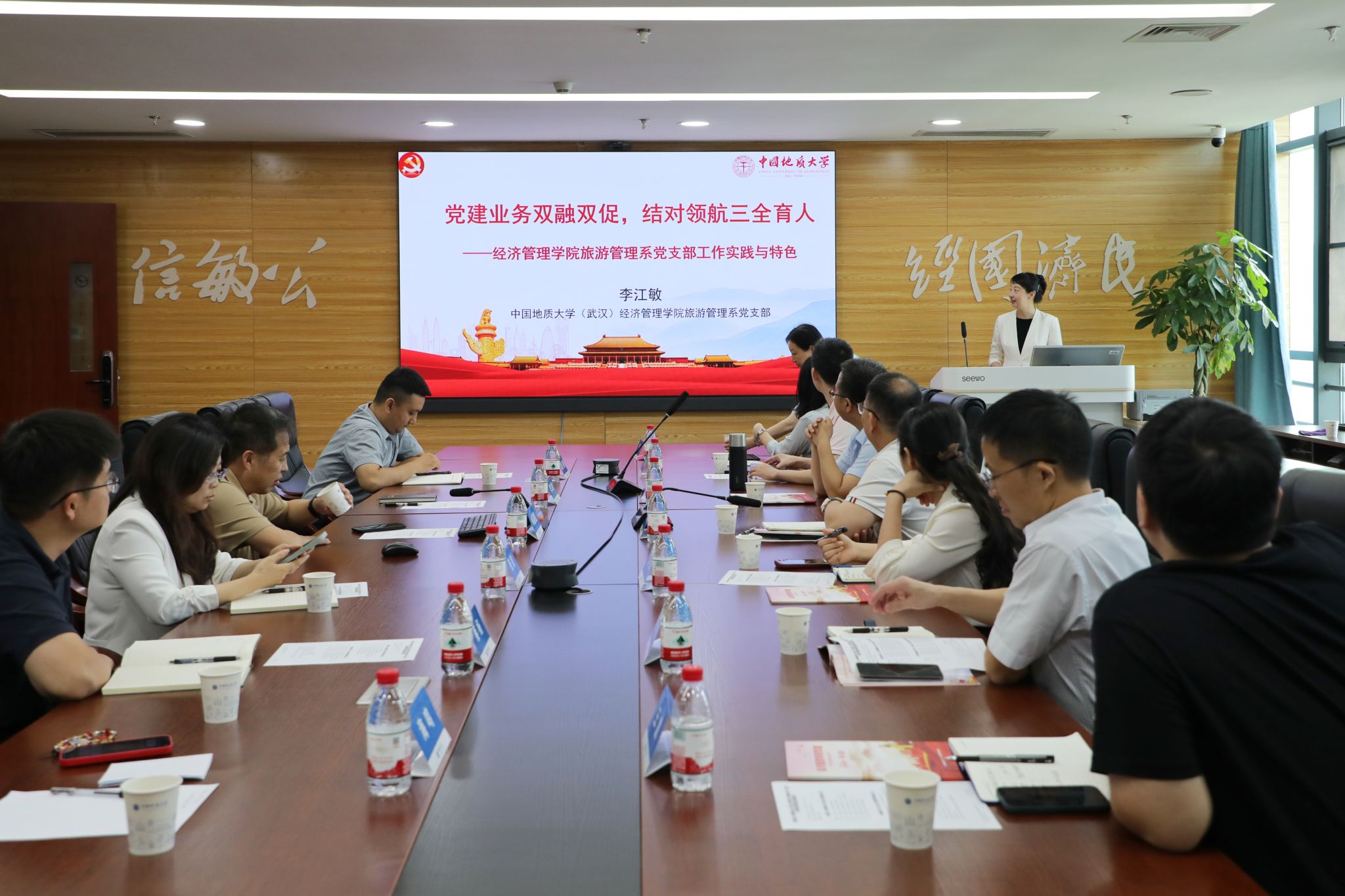 随后,我院旅游管理系党支部书记李江敏教授作《党建业务双融双促,结对领航三全育人——经济管理学院旅游管理系党支部工作实践与特色》专题分享,结合党支部书记“强国行”实践经历,详细阐述了党支部在党建与业务融合、结对育人等方面的工作经验和特色做法。