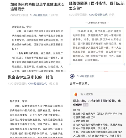 学院准确掌握全院学生身体健康状况,全面筑牢信息防线,辅导员和专业教师相互配合、形成合力,“全面掌握”与“重点关注”相结合,实行“日报告”制度,有效掌握和确保学生身心健康。学院坚持把工作重心放在宣传教育这一有效抓手,通过学院官方网站、公众号、年级群、教学群等渠道立体式、反复发布和强调《致地大寒假留校学生的一封信》《致全体地大学子的一封信》、《关于进一步加强学生留校及返校管理的通知》、《关于开通心理支持网络服务的通知》等重要通知,以微信、QQ等广泛宣传防控知识,确保全覆盖、全知晓,与广大学生保持通讯畅通,及时掌握学生身体健康状况。