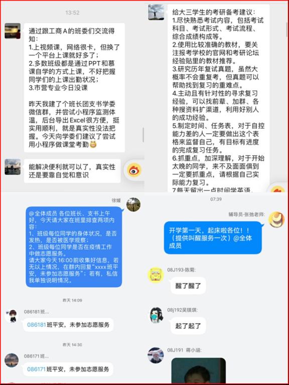 知己知彼,百战不殆。开学当日,辅导员们像往常一样快速投入工作状态。张弛老师贴心提醒全体同学按时起床,提供“叫醒服务”,同时积极协助处理直播课堂中出现的突发状况;赵家玮老师则持续保持与学生的沟通,总结出更好用的线上教学方式比如腾讯会议、腾讯课堂等渠道,供任课教师选择使用。